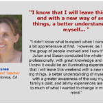 I didn’t know what to expect when I came, so I was a bit apprehensive at first. However, as I got to know the group of people involved and I saw the way that Julian and Susan conducted the whole workshop professionally, with great knowledge and experience, I knew it would be an illuminating experience. I know that I will leave this weekend with a new way of seeing things, a better understanding of myself, and also with a greater awareness of the way my past, my family’s past, and all my experiences are connected to much of what I wanted to change in my body and mind.